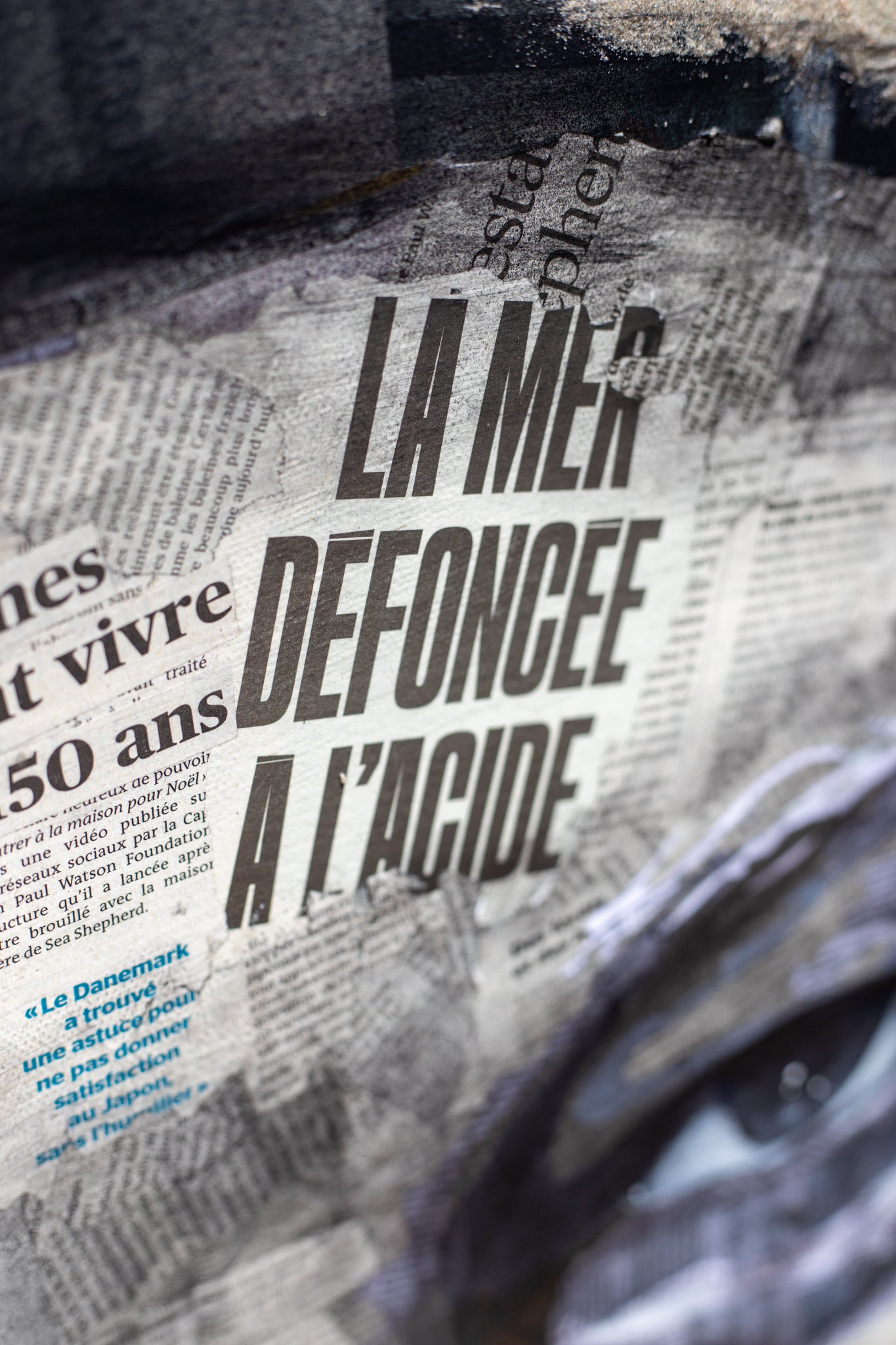 Her practice is grounded in a quasi-journalistic approach. Each work emerges from an immersion in narratives, faces, archives, and struggles. She collects newspapers, testimonies, and documents, which she cuts, fragments, and then reassembles. Newsprint becomes a living material, chosen for its fragility and its ambivalence: a space of truth, but also a place where stories vanish as quickly as they appear.