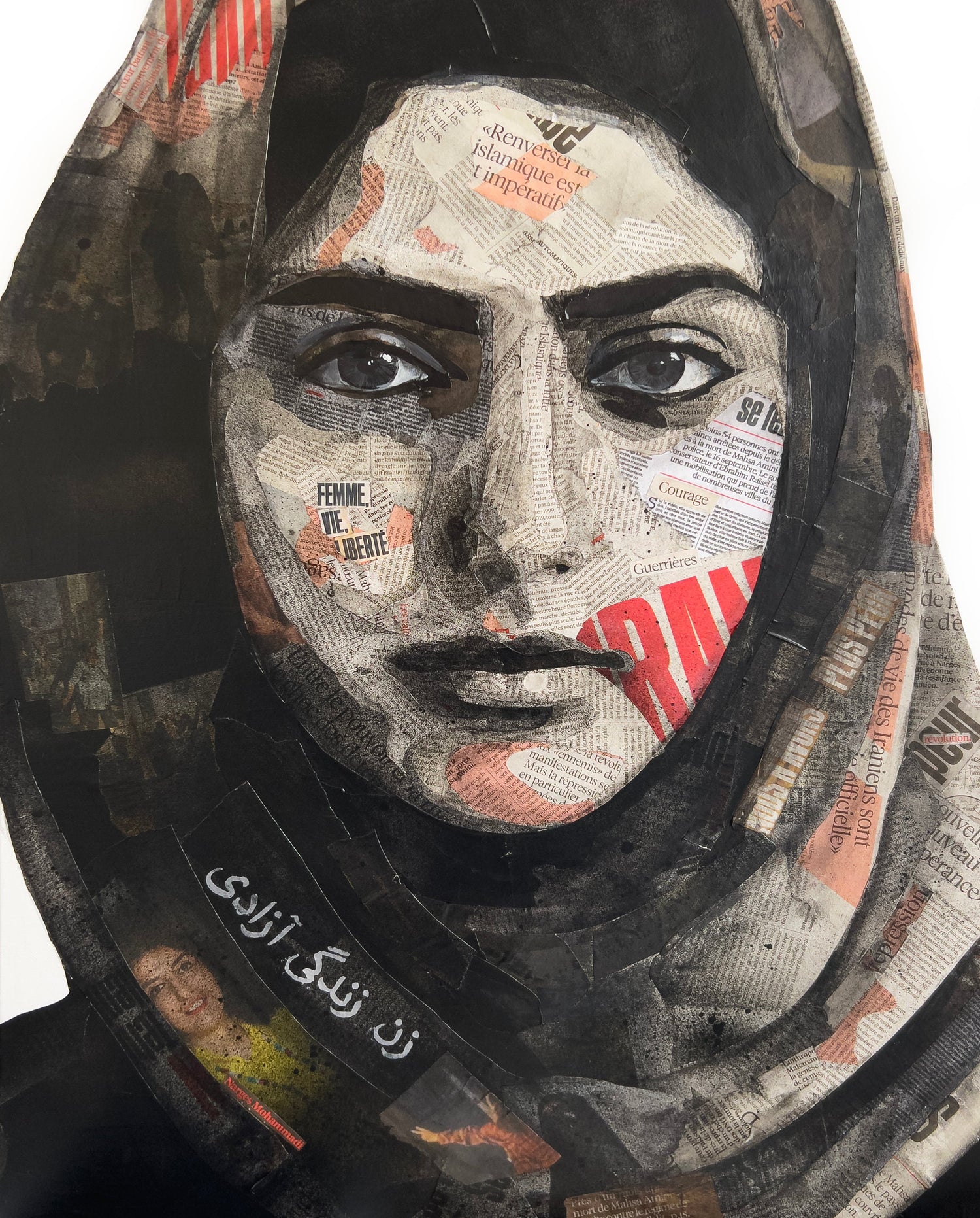 Through these recompositions, she constructs visual mosaics in which each fragment carries its own weight. The black of the ink and the white of the paper form a restrained yet intense grammar, shaped by tension, depth, and humanity. This transformation of reality gives rise to a singular visual language, at the crossroads of engaged art and contemporary memory.